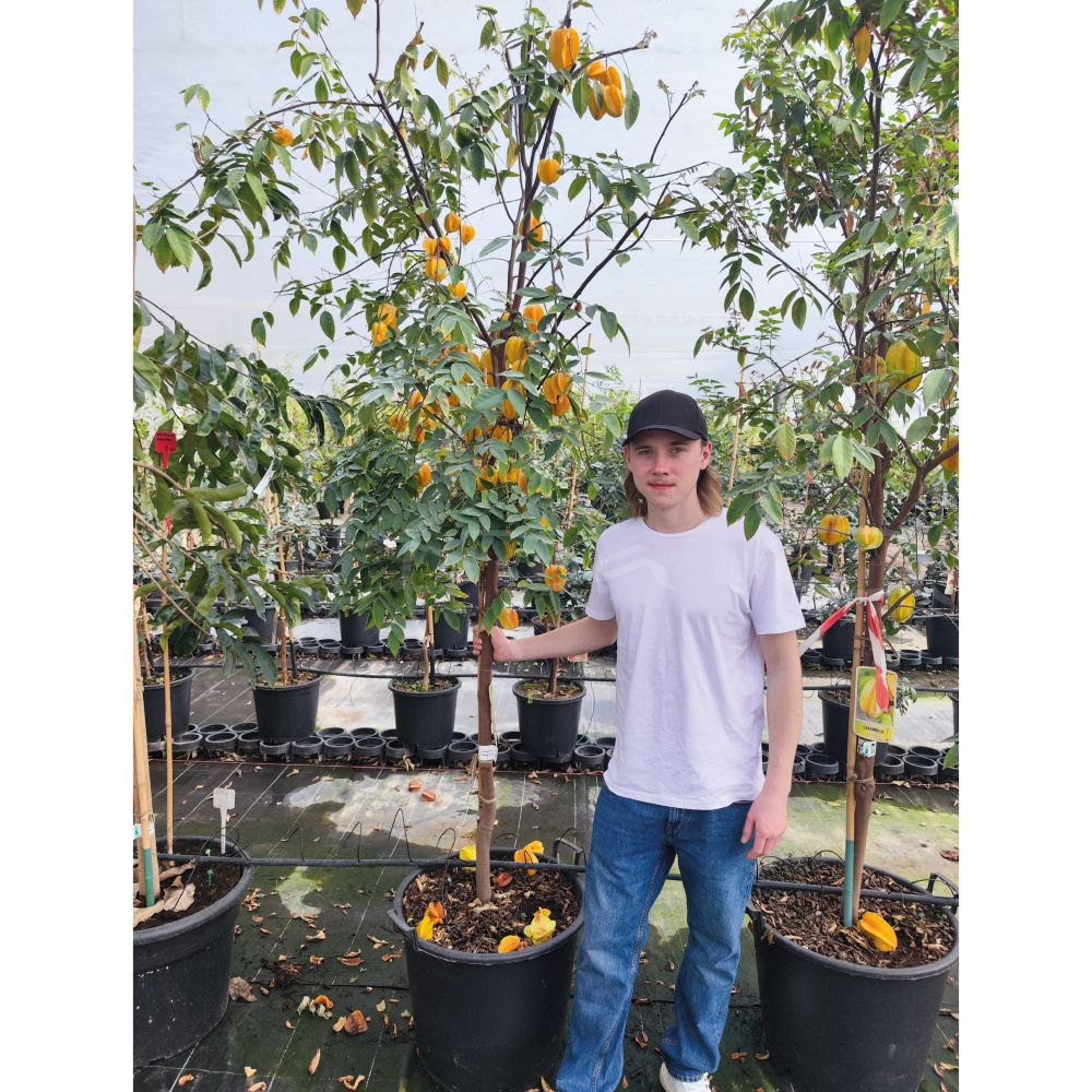 Carambola (stjärnfrukt) får relativt stora sötsyrliga frukter. Blommar med små rosa blommor på våren och sommaren, pollineras med pensel om de blommar innan insekterna har vaknat. Odlas i kruka eller uppvärmt växthus. Förvaras frostfritt på vintern. Går bra att ha inomhus men måste stå ljust. Sorterna vi har är Fwang tung och Arkin. Delvis självfertila – ger mer skörd med annat carambolaträd i närheten eller i samma kruka.